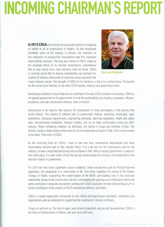 After spending many years as a Director at COCA, Gary has stepped up to the Chairmans role. COCA is the collective voice of Ontario Construction Associations.