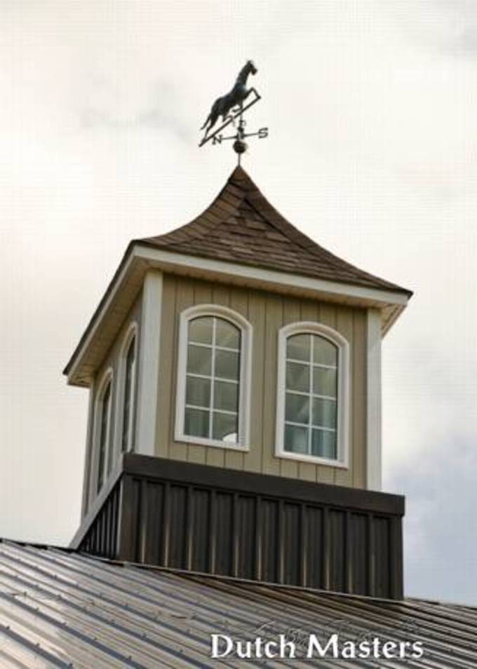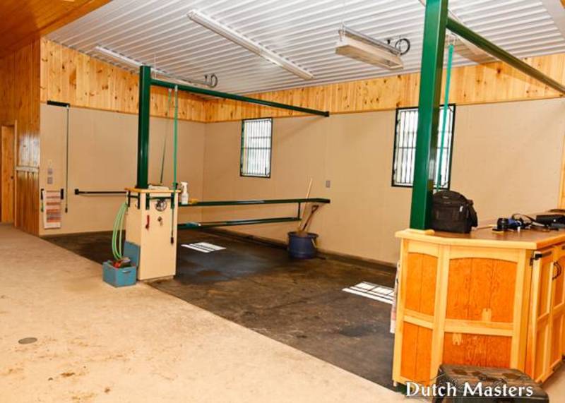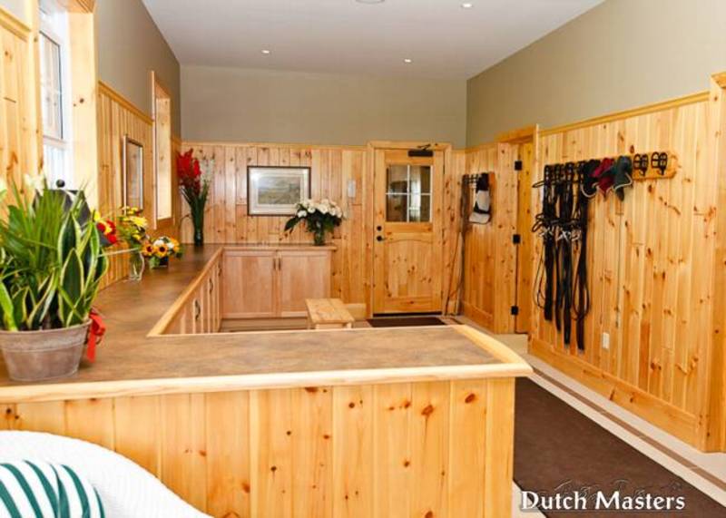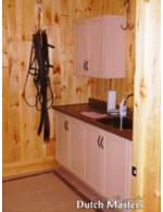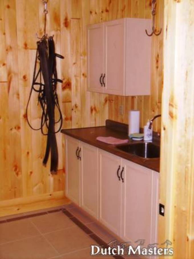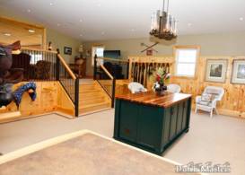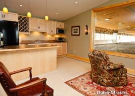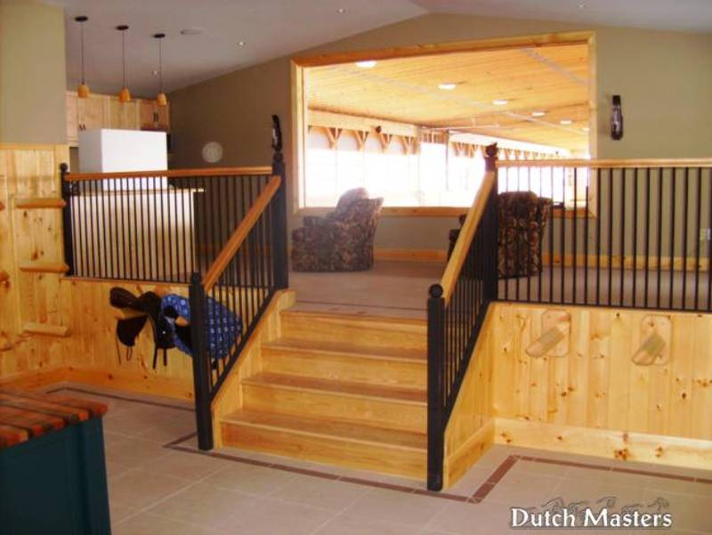 Raised viewing room with tack area and kitchenette featuring custom cabinets