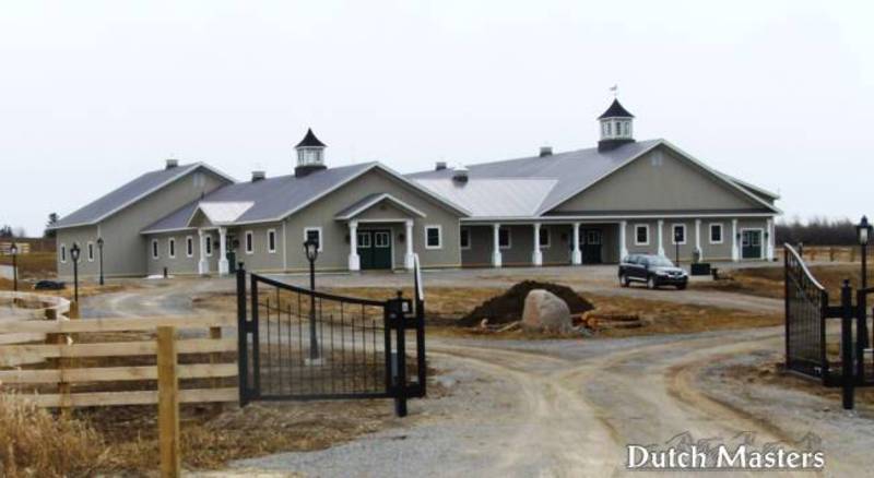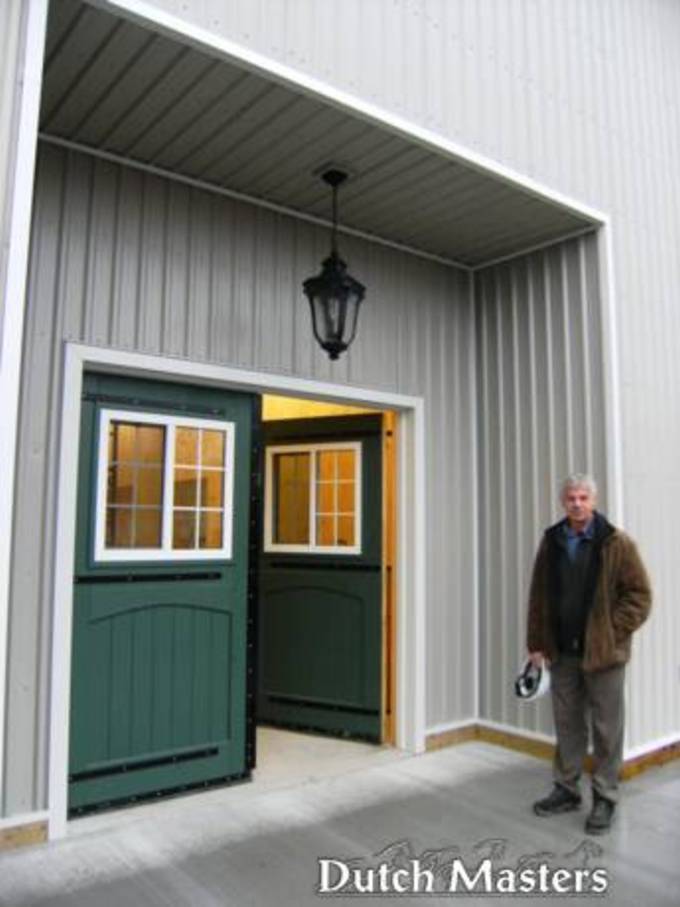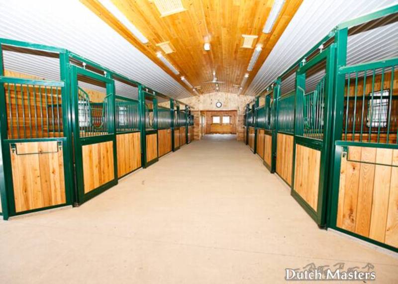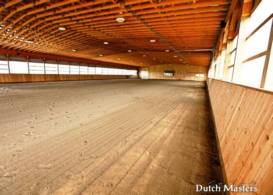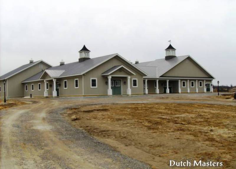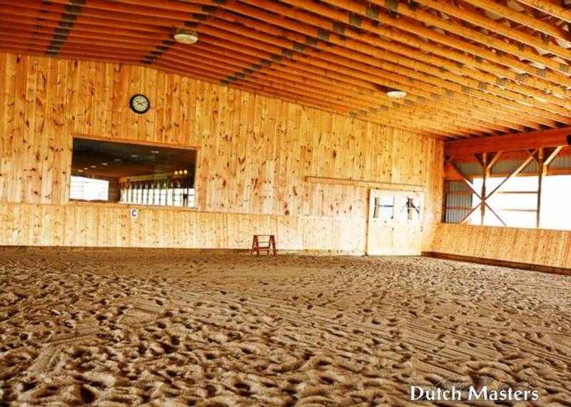 208' x 80' indoor arena pole frame construction with sloped kickboard, vent panels, induction lighting, insulation