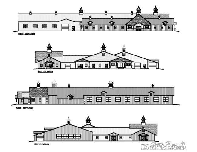 Dutch Masters worked with the client to develop a unique farmstead layout, including the 16 stall barn, service area, viewing room, indoor riding arena, hay barn, equipment shed, outdoor sand ring, paddock layouts, manure storage, jump storage, entrance location and driveways and parking. The plans also considered the location of the client's future new residence for privacy and view lines.